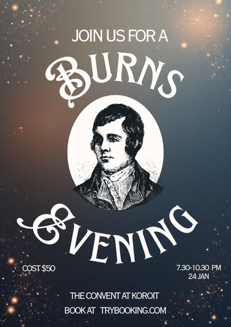 Join us for a memorable celebration of Scotland’s beloved national poet at The Convent at Koroit. Set within the beautiful surrounds of the Convent, this cultural evening features poetry, song, bagpipe, and other music inspired by the life and works of Robert Burns, often called the “Bard of Scotland,” whose writing captured love, friendship, nature, and social justice with wit and warmth.
